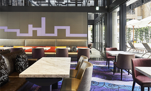 The greeneries, gentle breeze, and lobby with elevated ceiling are complemented by the fusion of urban scenery and luxuriant view of Yuanshan outside, providing a peaceful venue for the guests to enjoy alcoholic beverages.