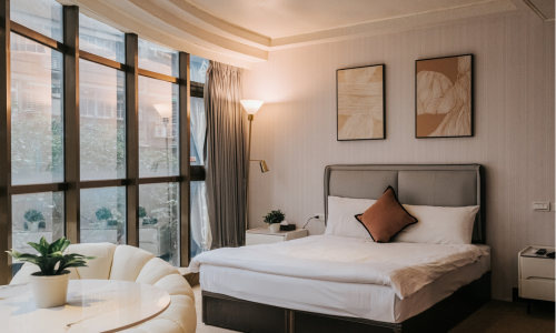 客房面積約 33 平方公尺,配有舒適床鋪,提供旅客良好的休憩品質。房內設有空調、可收看有線頻道的平面電視及私人衛浴,滿足基本舒適與便利需求。此房型配置一張床,適合兩位旅客入住。