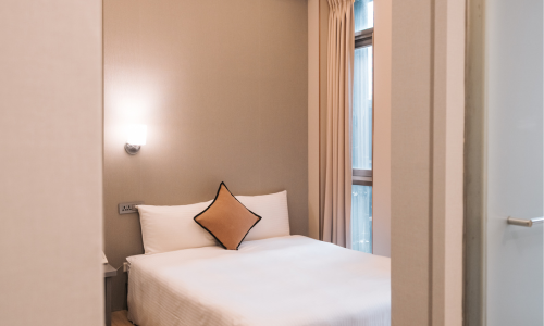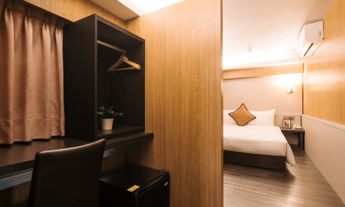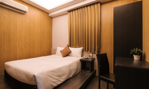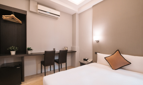 房間面積約 14 平方公尺,設有一張舒適雙人床,提供旅客良好的休憩品質。房內配備空調、平面電視、隔音牆、衣櫃及電熱水壺,私人衛浴提供免費盥洗用品、步入式淋浴間、吹風機與拖鞋。客房亦可欣賞市景,是注重舒適與便利的旅客理想選擇。