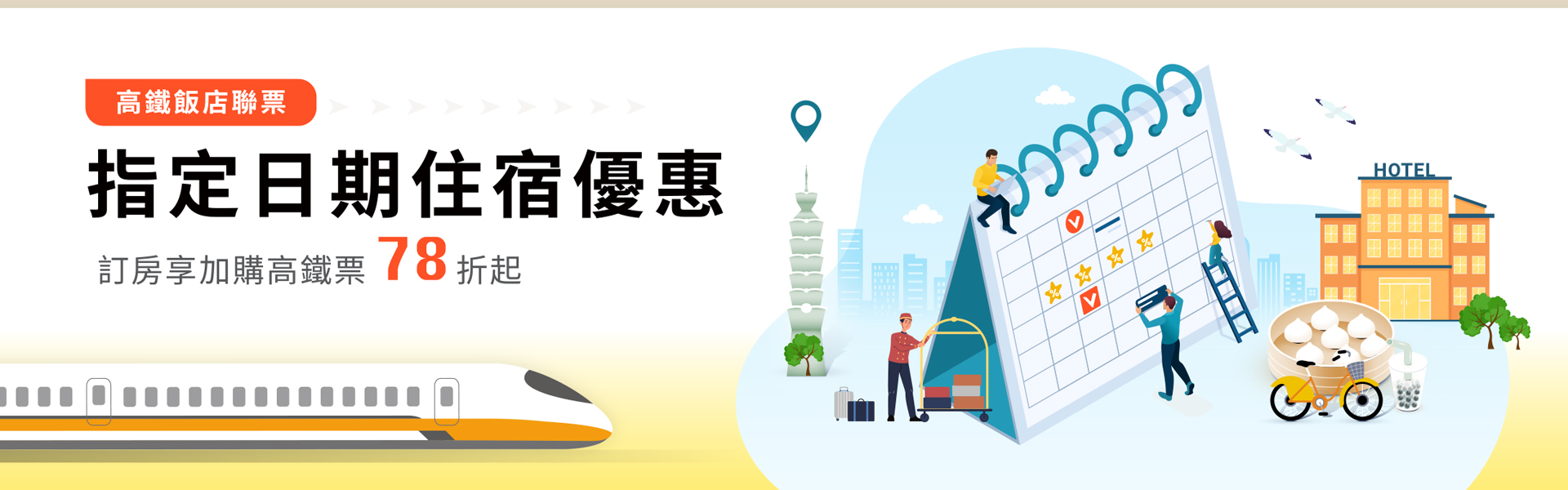 • 即日起,官網訂房加購2026/03/01~05/31期間搭乘高鐵票,享平日(週一至四)75折、假日(週五至日)及高鐵疏運期間85折優惠,雙人左營-台北來回最高省1,500元起。非上述期間仍享有平日78折、假日及疏運期間85折優惠;優待票(含敬老、愛心、孩童票)票價同高鐵車站售價(全額票價之5折),不另享額外優惠。